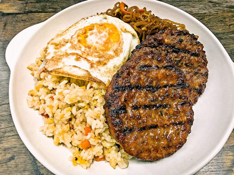 Chinese-style vegetable fried rice (mixed vegetables + egg; ingredients cannot be changed), two juicy traditional Korean-style patties made with a blend of beef and pork, japchae (glass noodles), fried egg, and onion flakes in a rice bowl; honey mustard sauce provided separately.