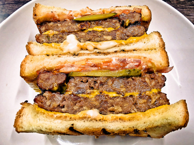 Sandwich with two 100% beef patties, two slices American cheddar, sauteed onions, tomato, baby dill pickles, and onion flakes
