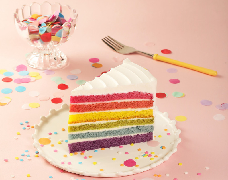Visually stunning cake with cheese cream sandwiched between rainbow-colored sponge layers