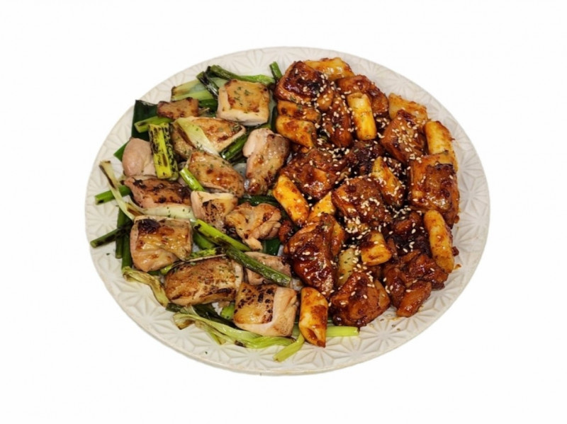 Half sweet & spicy BBQ chicken, half salt-grilled chicken, roasted green onions and garlic shoots, rice cakes