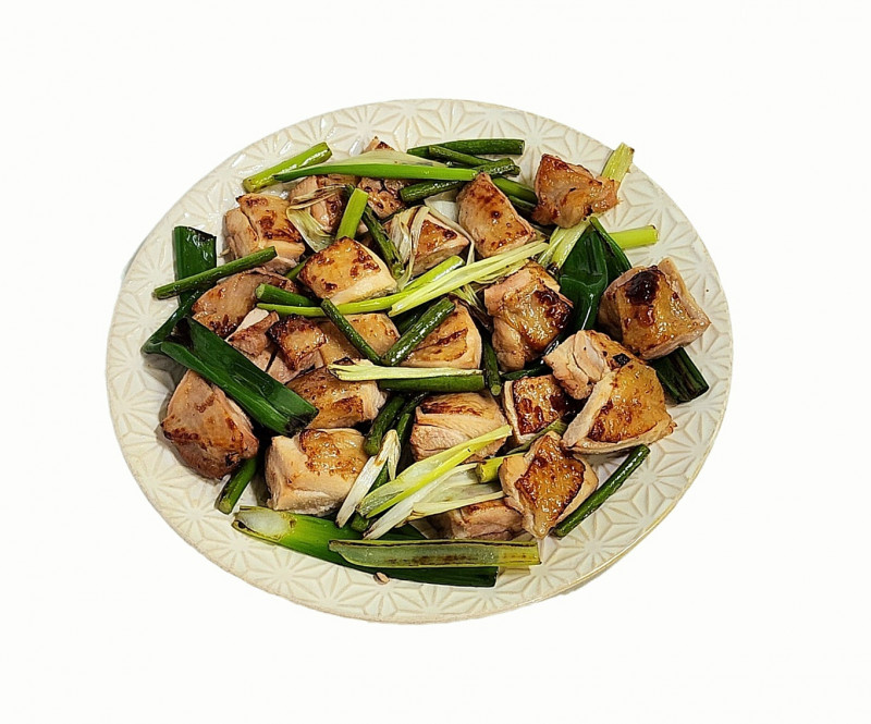 Charcoal-grilled chicken thigh (700g), roasted green onions and garlic shoots; served with pickled radish cubes, 2 mustard sauces, and salt