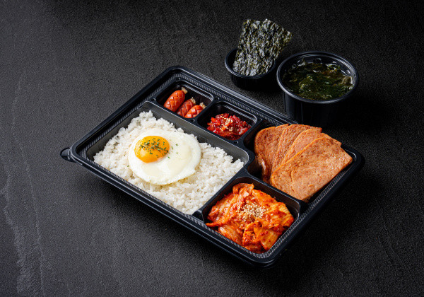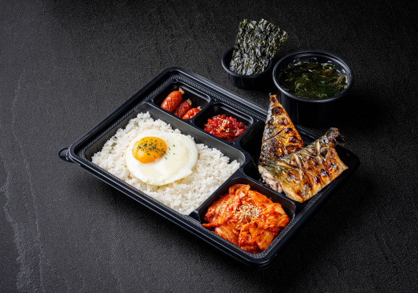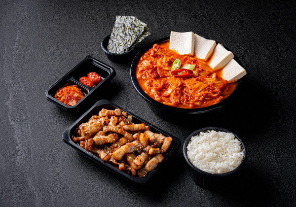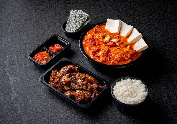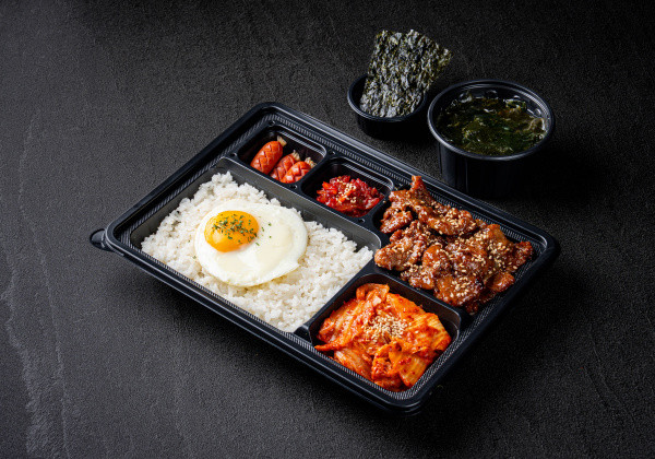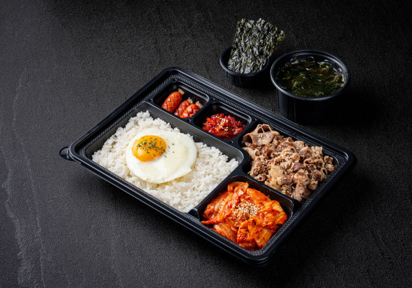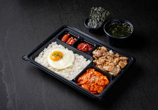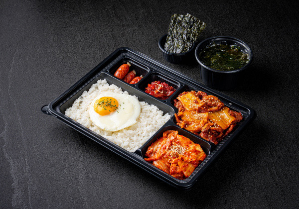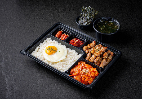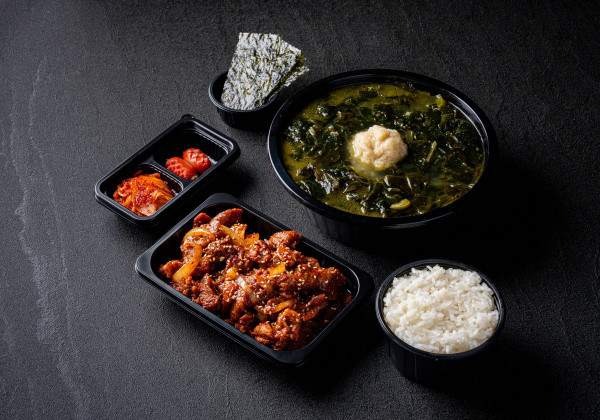 Bapsang's signature stir-fried pork jeyuk lunchbox; served with seasoned seaweed and a mini seaweed soup