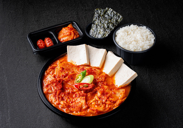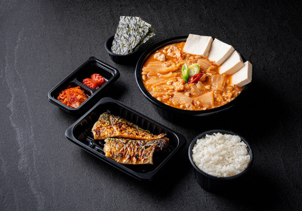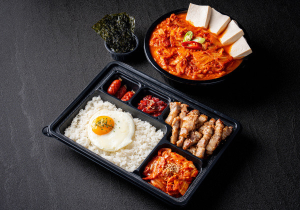 Stir-fried kimchi and jeyuk pork lunch box; served with seasoned seaweed and a mini seaweed soup