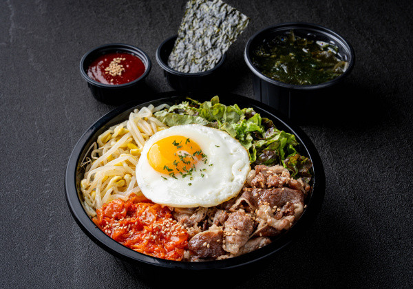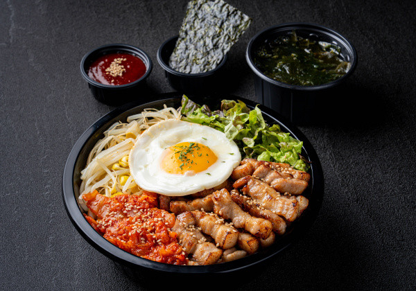 Bibimbap with thinly-sliced daepae pork belly, lettuce, bean sprouts, stir-fried kimchi, a frief egg, bibim sauce, seasoned seaweed, and a mini seaweed soup