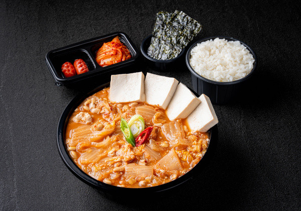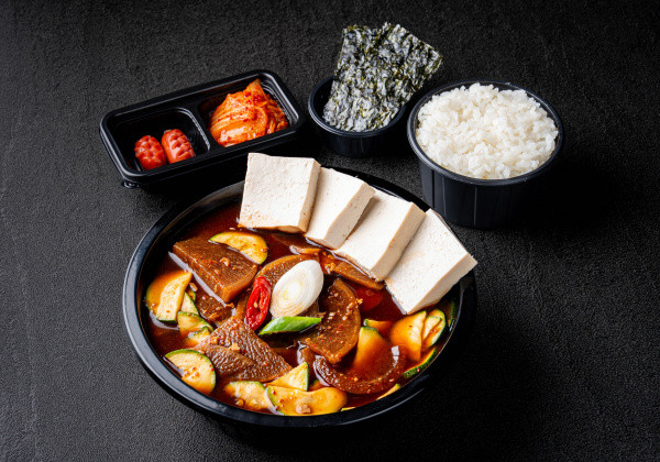Chadol brisket and soybean paste stew with steamed rice, 2 side dishes, and seasoned seaweed