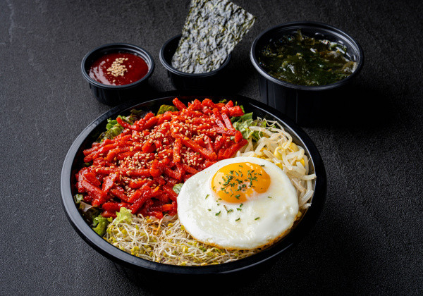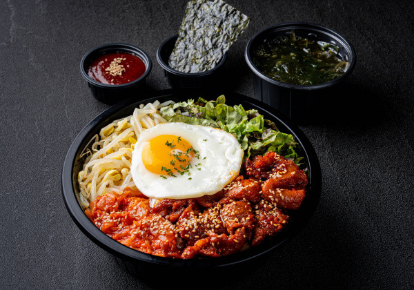 Bibimbap with spicy stir-fried pork jeyuk, lettuce, bean sprouts, stir-fried kimchi, a fried egg, bibim sauce, seasoned seaweed, and a mini seaweed soup