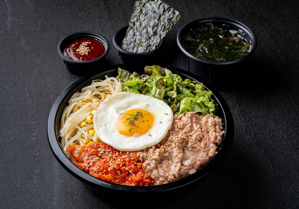 Bibimbap with tuna, lettuce, bean sprouts, stir-fried kimchi, a fried egg, bibim sauce, seasoned seaweed, and a mini seaweed soup