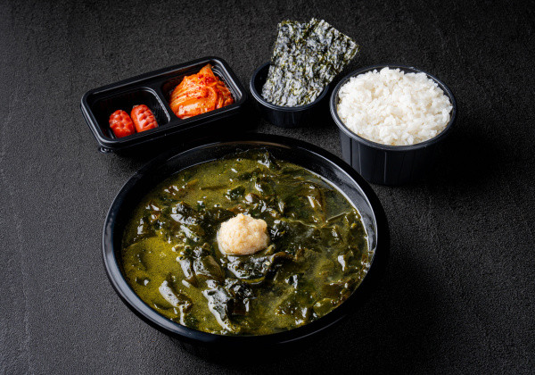 Thinly-sliced daepae pork belly lunch box; served with seasoned seaweed and a mini seaweed soup