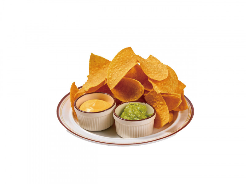 Crispy nacho chips served with guacamole and cheese sauce, perfect as a snack with drinks