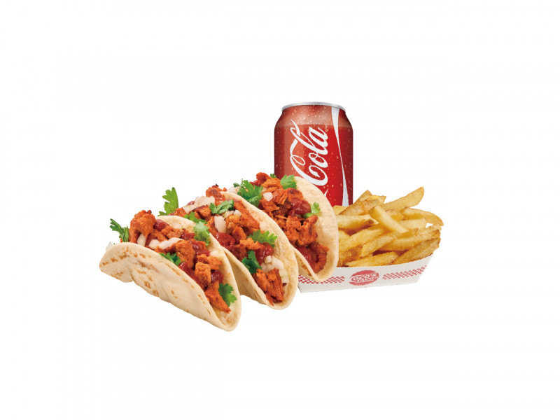 Chipotle tacos (3pcs) loaded with meat and vegetables served with fries and drink in a full combo